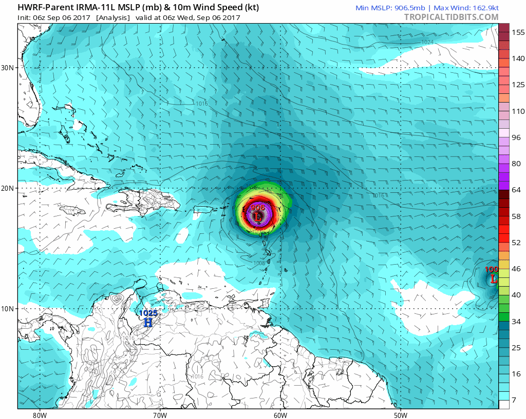Hurricane Irma has been holding peak winds of 185 mph for nearly a full day. The satellite video below shows the contrast of danger and beauty of this storm along with the stadium effect of the eye from space looking down onto the ocean below. The movement is 16 mph to the west northwest. The worst part of the storm will be north of the Virgin Islands today, with the British portion of that region feeling the strongest winds. This will pass north of Puerto Rico but the edge of hurricane force winds might clip the north side of the island.