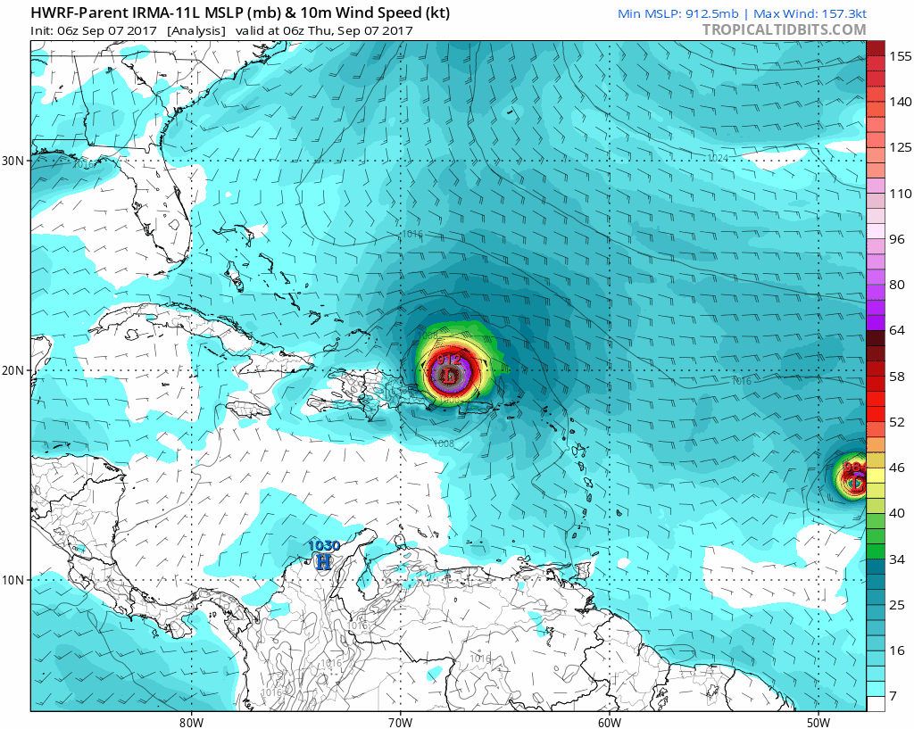 The exact track is critical. A shift of 50 miles to the east could save Miami to West Palm Beach keeping the strongest part and eye wall offshore. Still horrible for The Bahamas. If this track is correct and the eye wall hits Miami OR if it is just inland, this will be more catastrophic than any other weather event in our nation’s history. Miami has the 3rd most sky scrapers in the US. The strongest winds will be above the ground and without question will have trouble with winds over 140 mph as forecast below.