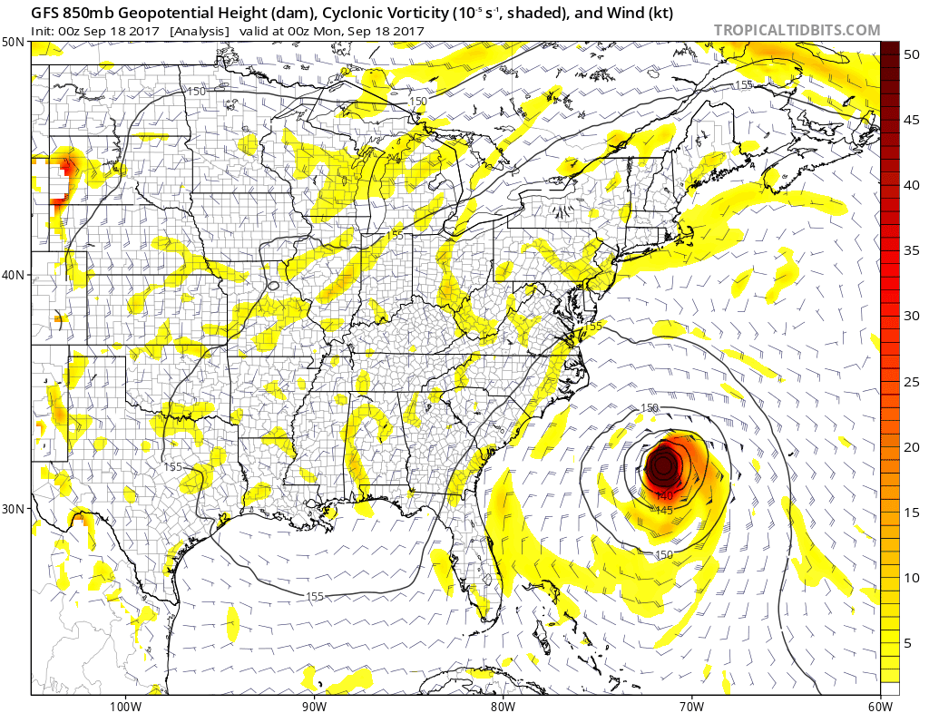 I need to point out that this is a abrupt change from the prior run that showed a double hit. This is due to a change in speed of both systems allowing Jose to hang closer to allow an impact on Maria. Any change in the speed will dramatically change this again.