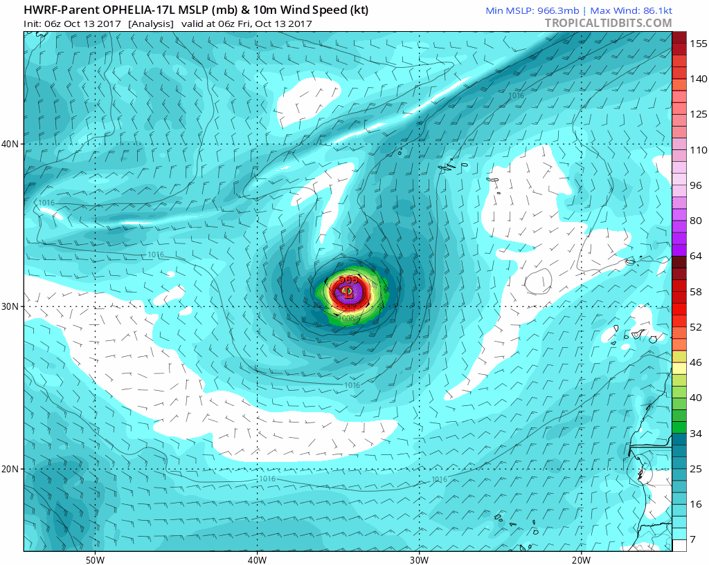 Hurricane Ophelia remains a Category 2 storm with 100 mph winds. It has broken away from the nearly stationary status and is moving to the east northeast at 12 mph. The rare thing here is that the waters in this part of the Atlantic tend to get quite cool along the path to the north. But a strong cold front will be grabbing Ophelia and increasing the forward speed so that it will hold on the the strength of a hurricane when it reaches Ireland on Monday October 16.