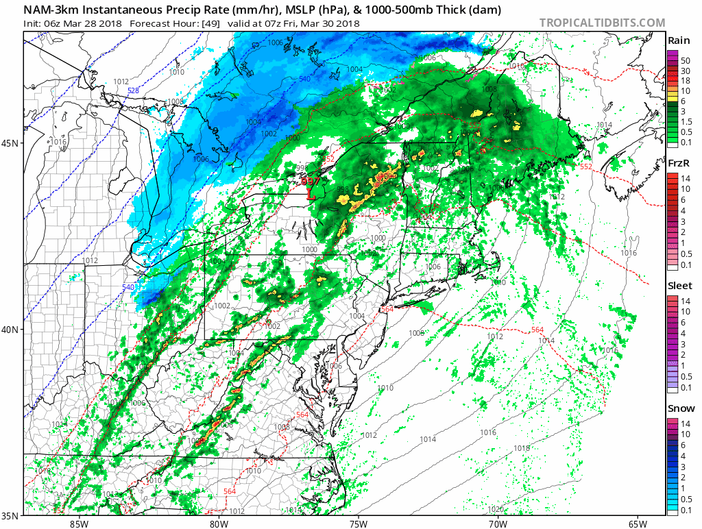 One week ago we had our largest snow storm of the season. Now are setting the stage for a big warm up to time out perfectly with the start of baseball season and opening day at Camden Yards for the Orioles. This morning, temperatures are still chilly and the warm air will slowly build to the north. We have another push of rain that will hold off the really warm air, but tomorrow we will get a window in the rain to allow the surge to 70ºF. Then, more rain and perhaps thunder on Friday.