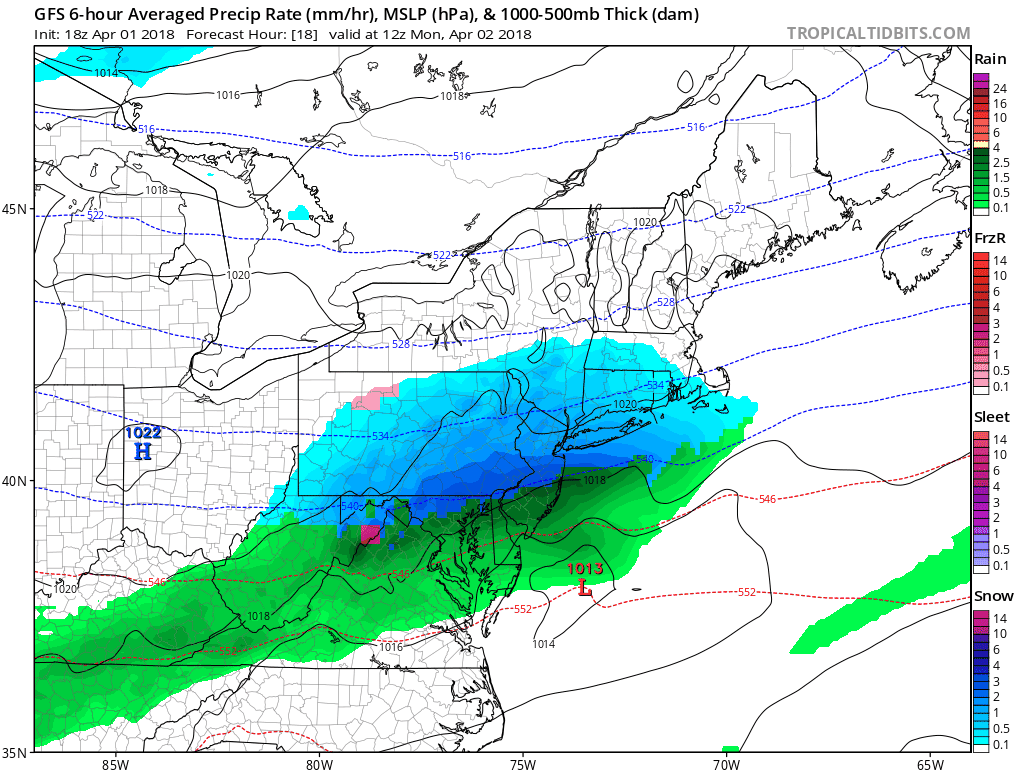 Easter Sunday brought a high temperature of 64ºF to Baltimore’s BWI. So why would we think about snow in the morning? Well, we did this same thing just as Spring began and surprisingly had more stickage than expected. The timing is perfect for an April snow event to do its thing since it will be right before sunrise. That is after maximum cooling overnight. This will be brief but intense… where the snow falls. So despite temps in the mid 30s, the heavy snow can overtake the ground in spots. This will begin as rain and change to snow between 3 AM and 6 AM. The entire event will be done for our area by 9 AM.