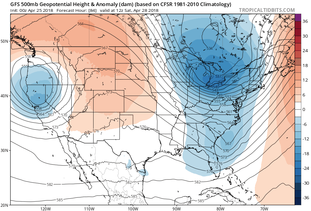 This weekend will be cool than average (blue) but next week shows the pattern change to warm us up (orange)