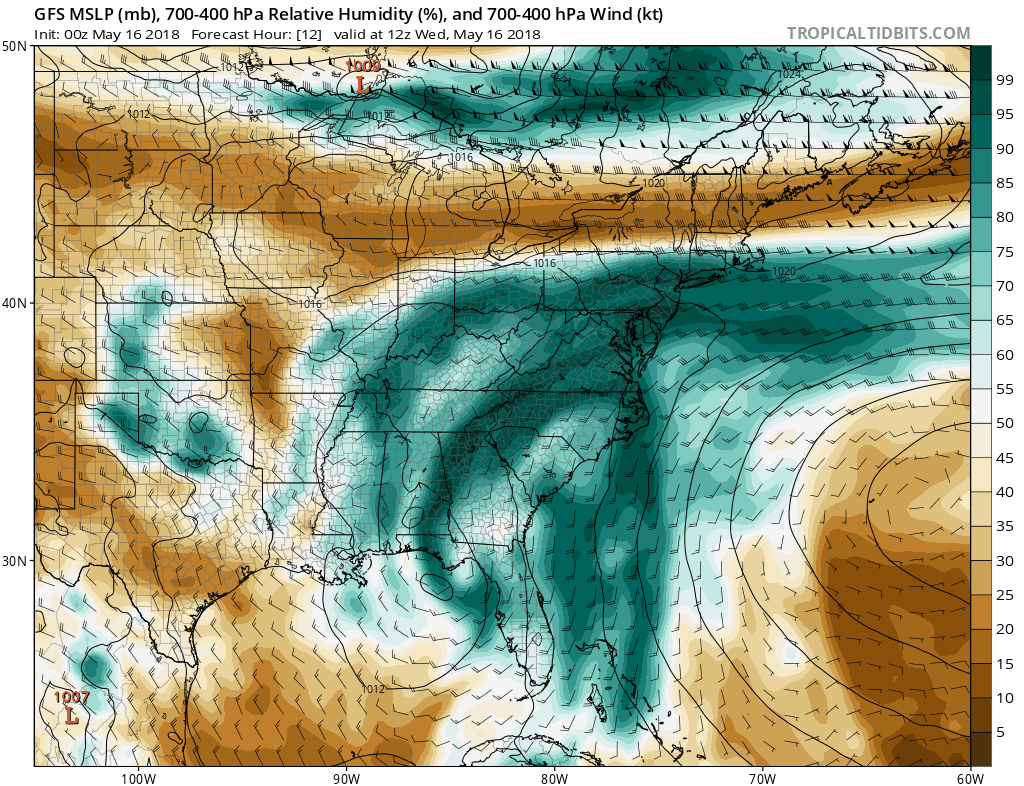 The stationary/cold front is just to our south, allowing us to remain with the cooler easterly wind flow today. That holds temps down. The tropical system in the Gulf of Mexico is pumping moisture north and funneling it into Maryland.