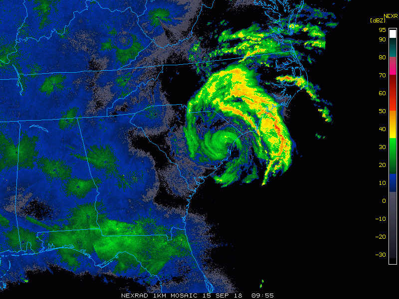 Tropical Storm Florence is located west of Myrtle Beach in South Carolina this morning but the wind flow continues to pump the heaviest rain and ocean water into North Carolina. As the storm crawls and hits the same areas today, we are watching some dry air try to erode away the clouds on the north side. Yes, some parts of our area will get sun today making for the nicer weather I suggested this weekend.