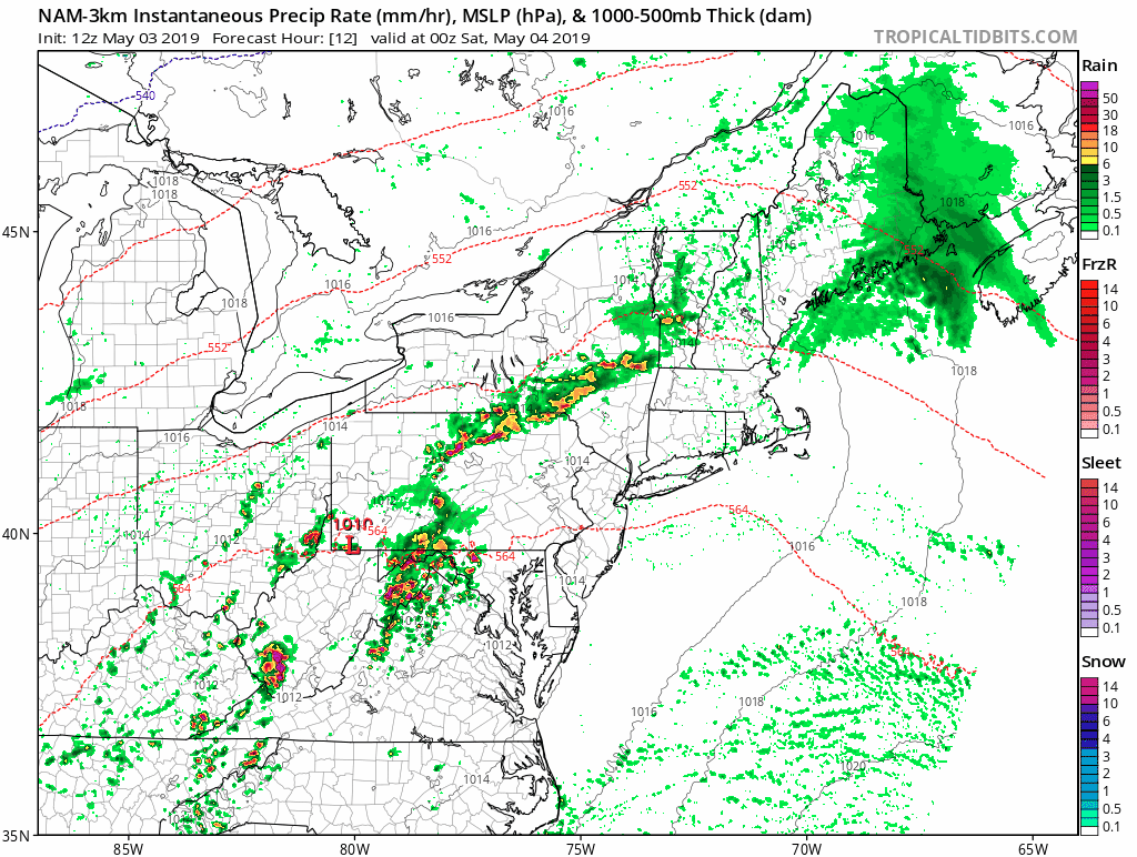 Here we can see a flare up of storms in the mountains just over the West Virginia border. These will be riding the ridges to the east-northeast. But the timing is up for debate.
