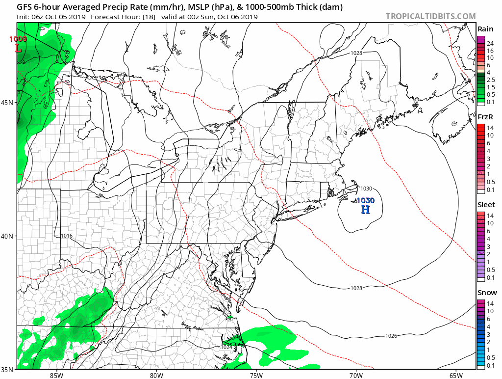 High Pressure is in control and will make for a sunny and cool autumn day. The next weather event will arrive over the next few days in the form of a slow moving front. This will help to boost temperatures ahead of it, and maybe bring some showers later Sunday on the west and north zones. But the rain will arrive Monday into Tuesday. However, there may be a sharp cut off for where the benefits fall.