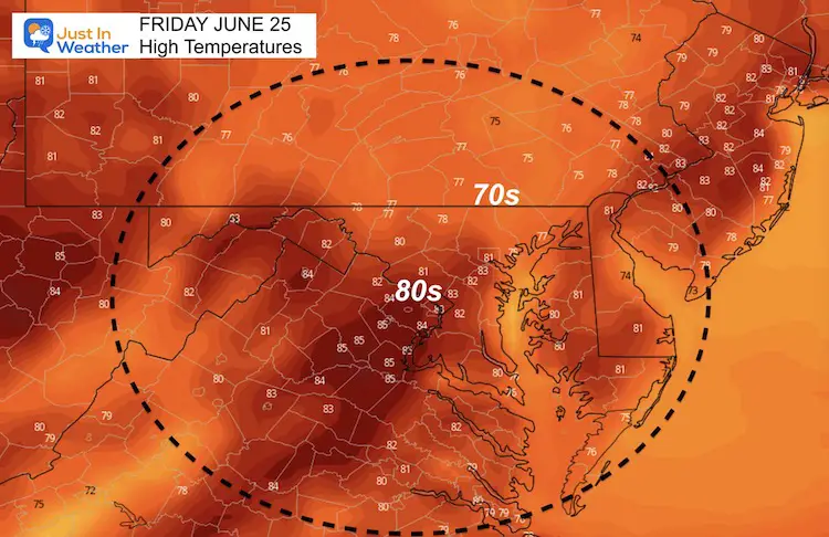 I get it, this is not summer weather, even though it feels great and has been a break on the air conditioning. If you want summer heat, it will be back this weekend. If we follow the accepted definition of a heat wave being more than three days in a row with high temps at 90ºF or above… Then we should start the count this weekend, into next week.